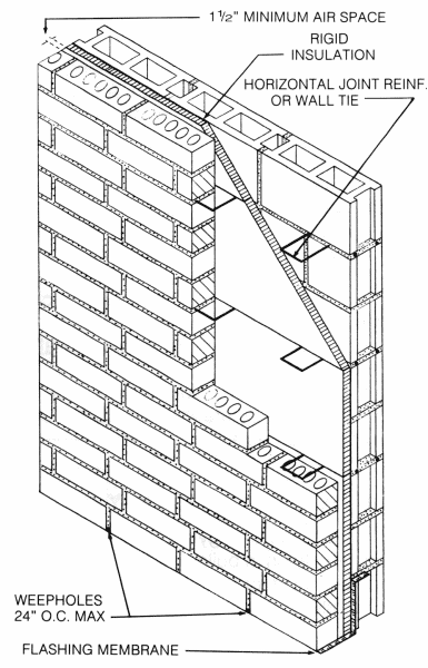 Cavity walls have a cavity (void, or space) between the exterior finish and the backup wall. This also called an ‘air space’