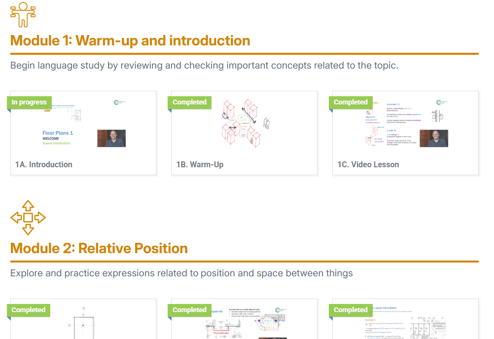 Each module teaches a specific function or set of target language in manageable steps.